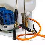 Двухтактный бензиновый двигатель оснащен большим бензобаком (700 мл). Химический бак на 25 литров гарантирует эффективную работу в течение продолжительного времени. Это означает, что средство для опрыскивания не придется часто доливать. Опрыскиватель комплектуется регулируемыми насадками для удобного разбрызгивания как для низкорастущих растений, так и для кустарников и деревьев. Агрегат отличается высокой скоростью распыления более 4 л. жидкости в минуту, а также большой дальностью действия от 6 до 10 м. Эргономичные ремни и мягкая подкладка на спине обеспечивают равномерное распределение нагрузки и комфорт. Мягкое крепление на спине позволяет работать значительно дольше, не испытывая болей в спине!