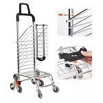 Каркас корзины изготовлен из легкого, но прочного и долговечного алюминиевого сплава. Передние колеса вращаются на 360°. Задние тройные колеса с встроенным подшипником из композитного материала в уникальной пропорции резины, каучука и пластика позволяют сохранять мягкость при низких температурах и хорошее сцепление с поверхностью, а сама конструкция колес позволяет преодолевать любые неровности дороги и даже сугробы.